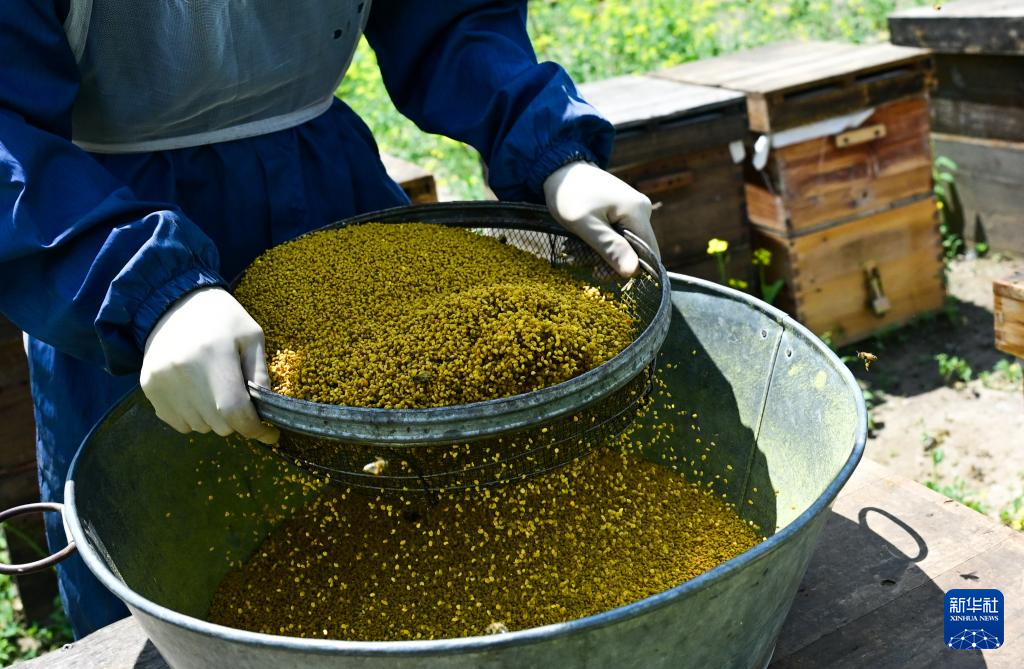 7月16日,在青海省海北藏族自治州门源回族自治县,吴昊将花粉过筛。新华社记者 齐芷玥 摄