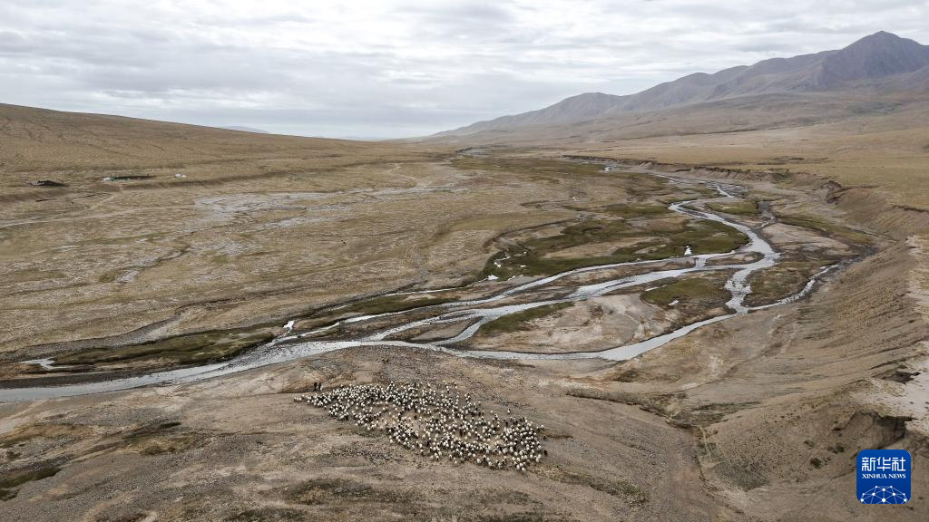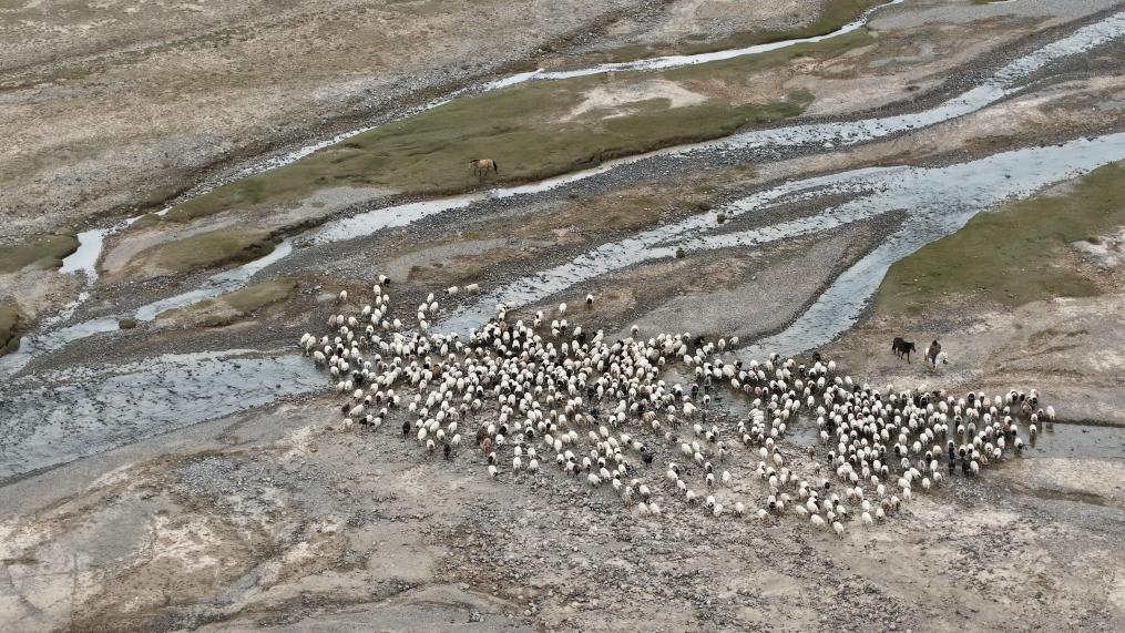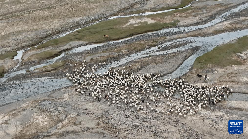 9月9日,在青海省海西蒙古族藏族自治州都兰县,牧民在转场途中(无人机照片)。新华社记者 齐芷玥 摄