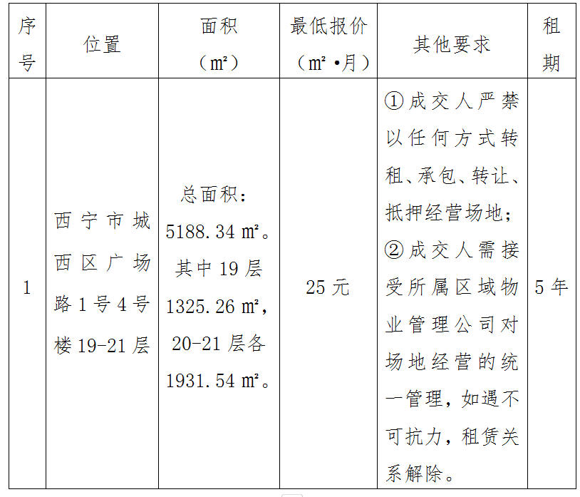 新华通讯社青海分社对青海省西宁市城西区广场路1号4号楼19-21层商业用房出租项目进行竞争性磋商招租,兹邀请符合本次磋商条件的承租方参加出租项目竞价。