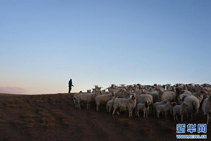 2025年11月13日,在青海省海北藏族自治州刚察县泉吉乡宁夏村草场,牧民才保将羊群赶回羊圈。新华社记者 齐芷玥 摄